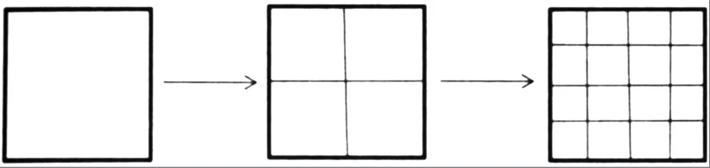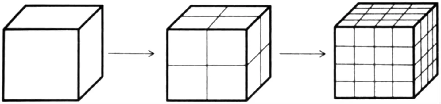 圆这样的二维对象有周长和面积。如果是三维,就分别对应表面积和体积。如果是四维,表面积和体积则分别对应于“表面”体积和超体积——这个量很难想象,因为我们天生擅长思考三维,不擅长思考四维。表面积与体积呈指数为 2/3 的比例关系,通过类似的论证,就可以知道四维的表面体积与超体积呈指数为 3/4 的比例关系。