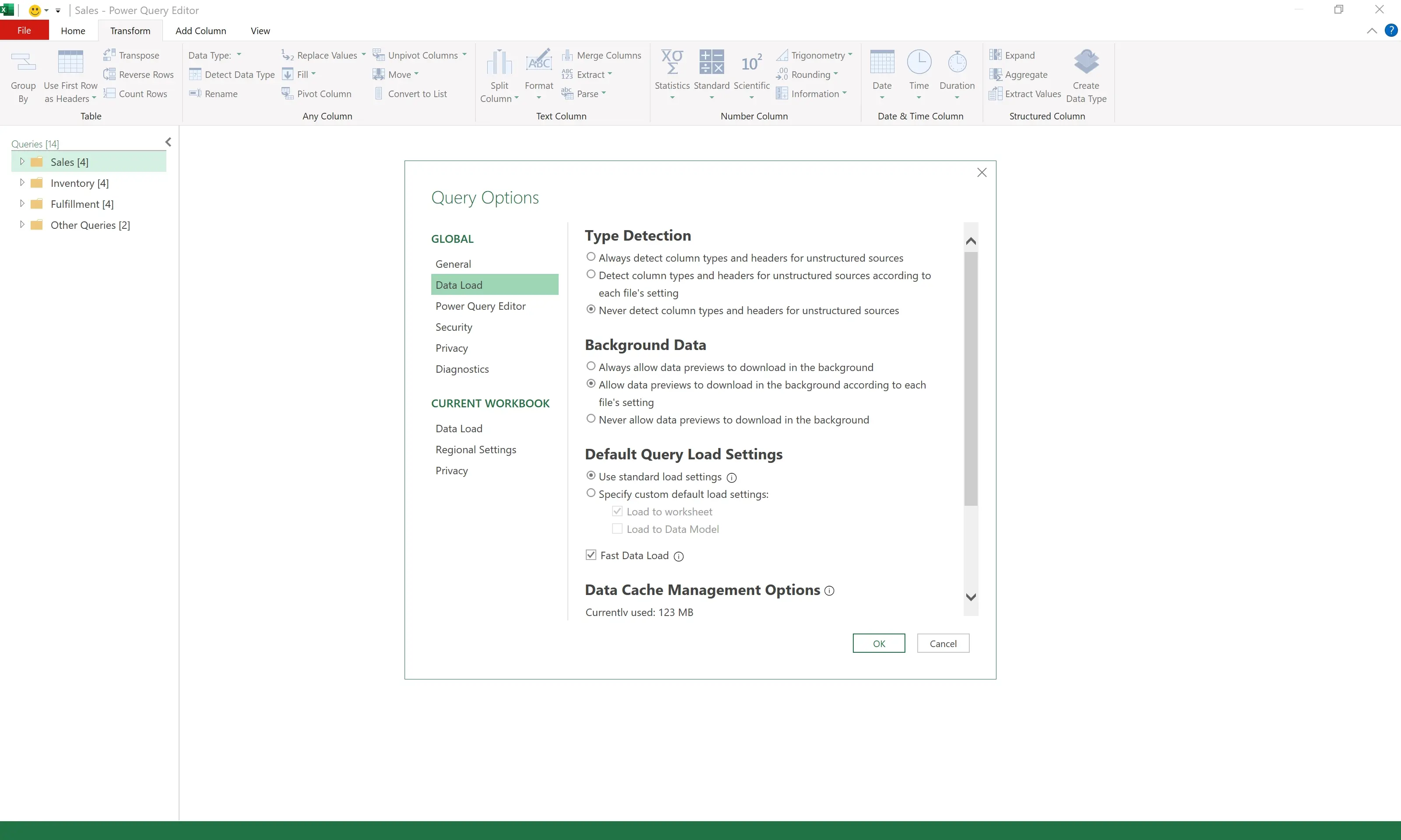 - Excel > Power Query Editor > File > Options and settings > Query Options > GLOBAL > Data Load