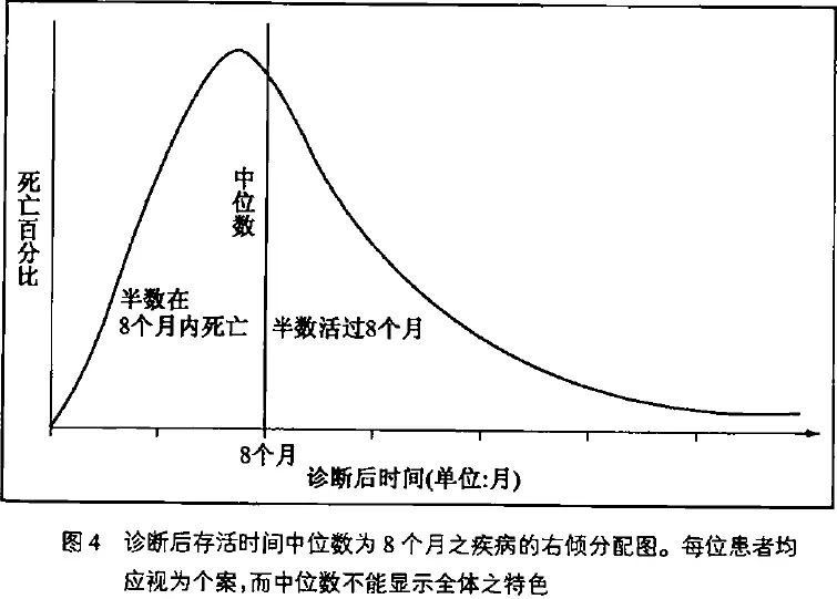然后在这紧要关头,我的洞察力支撑了我的生存意志。我思考差异问题;推论出死亡的分配一定是非常地右倾,也就是说在平均值的某种标准周围,呈现非常不对称的分布,而且右倾的程度一定远大于左倾。在最小值 0(诊断确定之后,立即死亡)和中位数(8 个月)之间,空间非常之小。差异的一半都挤在曲线的左半部(图 4),也就是最小值和中位数之间。但是理论上,右半部可以无限延伸,至少也可能延伸到老年。(统计学上以“尾端”称呼这种分布的尖端。所以左尾端紧靠 0 的纵轴,右尾端的最大值就是人类的寿命。)我尤其需要知道差异扩张的形式和程度。我也了解一切因素都指出,我的可能落点应该在右尾端。因为我还年轻、斗志高昂、居住于有最好医疗设备的城市、家人支持我,而且在患病初期就发现。因此我对于右尾端(我的可能落点)较感兴趣。还有什么比这样的推论更令人振奋的吗?我再详查资料,确定了我的推论:差异极端右倾,因为有的人确实活了很久。我看不出有什么理由,不能跻身于这群右尾端的居民行列之中。这个推论当然不能保证我可以享有正常的长寿,但至少我在紧要关头得到了最珍贵的礼物:我可以预期有足够的寿数来思考、计划和战斗。以前我曾经依据实际的资料,对于差异的重要性和平均数的有限功能,做过统计学的推论。我活用了知识,也获得救援。(这个故事另外还有更有利的结果。我的状况已经是朝向右尾端了,实验性的疗法又很成功,我的病几乎痊愈。老式的分配观念无法预测新的情况。我相信,由于治疗成功,我正在朝向右尾端前进:死亡时的年龄可能是大数目的两位数,甚至可能是三位数。)