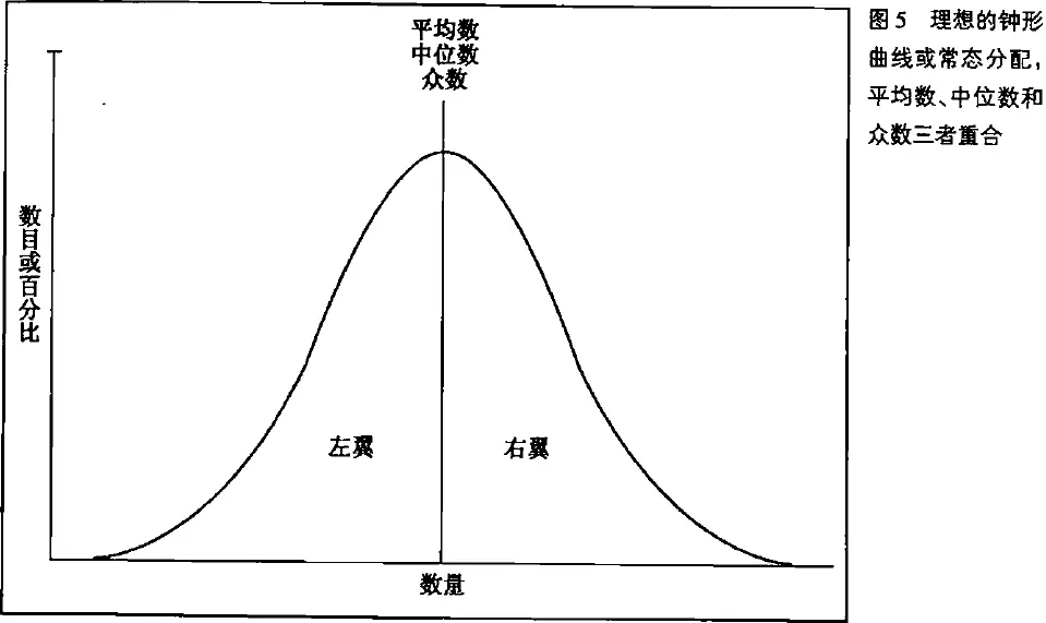在高度倾斜的分配中,平均数是衡量“平均值”或“平均”观念的可怕方法。原因是只要引人一个盖茨,整个平均数就大量右移;在平均数右方的 10 亿元(他的年收入),作用等于在平均数左方平均收入 10000 元的 100000 人。所以平均数远离最普遍的分布高峰(众数),结果停在钟形曲线倾斜方向的侧翼(图 7)。中位数虽比平均数正确,但仍然离开钟形曲线的顶点过远,位于倾斜分配的侧翼(仍请参阅图 7 以及有关的讨论)。