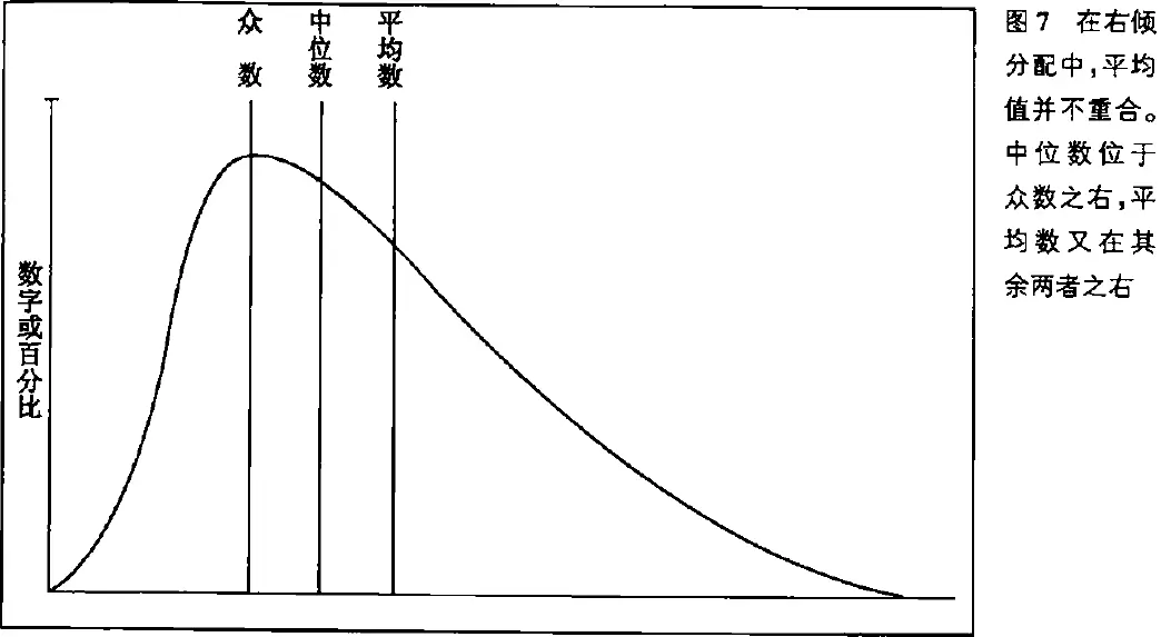 前面讨论过收入的右倾分配,显示出如何取得较高的平均数和较低的众数。通常当分配的倾斜厉害时,平均数就朝倾斜方向移动,中位数移动程度较低,众数则安然不动。所以在右倾分配的情况下,平均数的值通常大于中位数(图 7)。如果从对称分配开始(众数、中位数和平均数重合),然后使差异成为右倾分配,平均数移动最大,因为右尾端新增一个百万富翁,就可以平衡左端的众多贫民。中位数变化较小,此时一个贫民就可以平衡这个百万富翁,因为这时只计算两边的人数而已。(如果只增加右边人口的财富,人数不增,中位数可能完全不动。如果人数也有增加,中位数也会往右移动,但是程度不及平均数。)这时众数可能毫无变动,而平均数和中位数则在渐增的右倾趋势中,有所增加。所以纵然富人数目持续增加,每年的平均收入,可能仍维持在 2 万元。