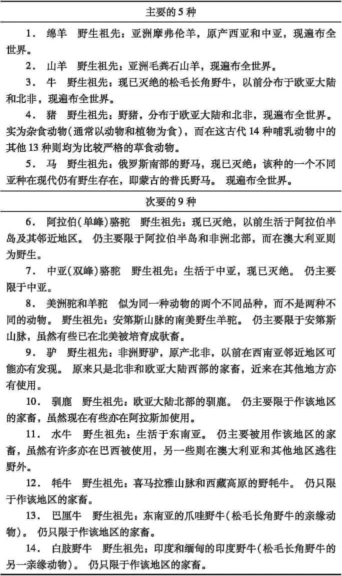 动物资源的分布一样不平均。适于人类豢养的家畜,始终只有马、牛、羊、猪、狗这几种。理由是:一种野兽要是没有适合当家畜的「天性」,就当不了家畜。在人类历史上,许多改变「野兽」为家畜的努力都失败了。猎豹、斑马不用说了,连大象至今都不是家畜。非洲是人类演化的摇篮,有最悠久的人类活动历史,又是著名的野兽大地,可是人类在非洲驯化的哺乳动物,大概只有古埃及的驴与猫。