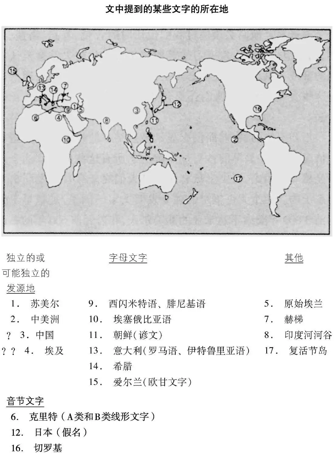 人类历史上,文字独立发明过几次而已,而且是在最早发展出粮食生产生计的地区。其他的社会,或者从那几个中心直接采借,或受到那些书写系统的启发,发展出自己的文字。