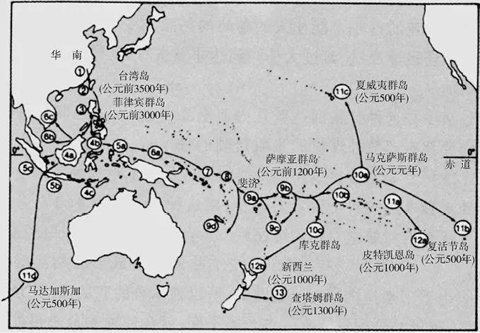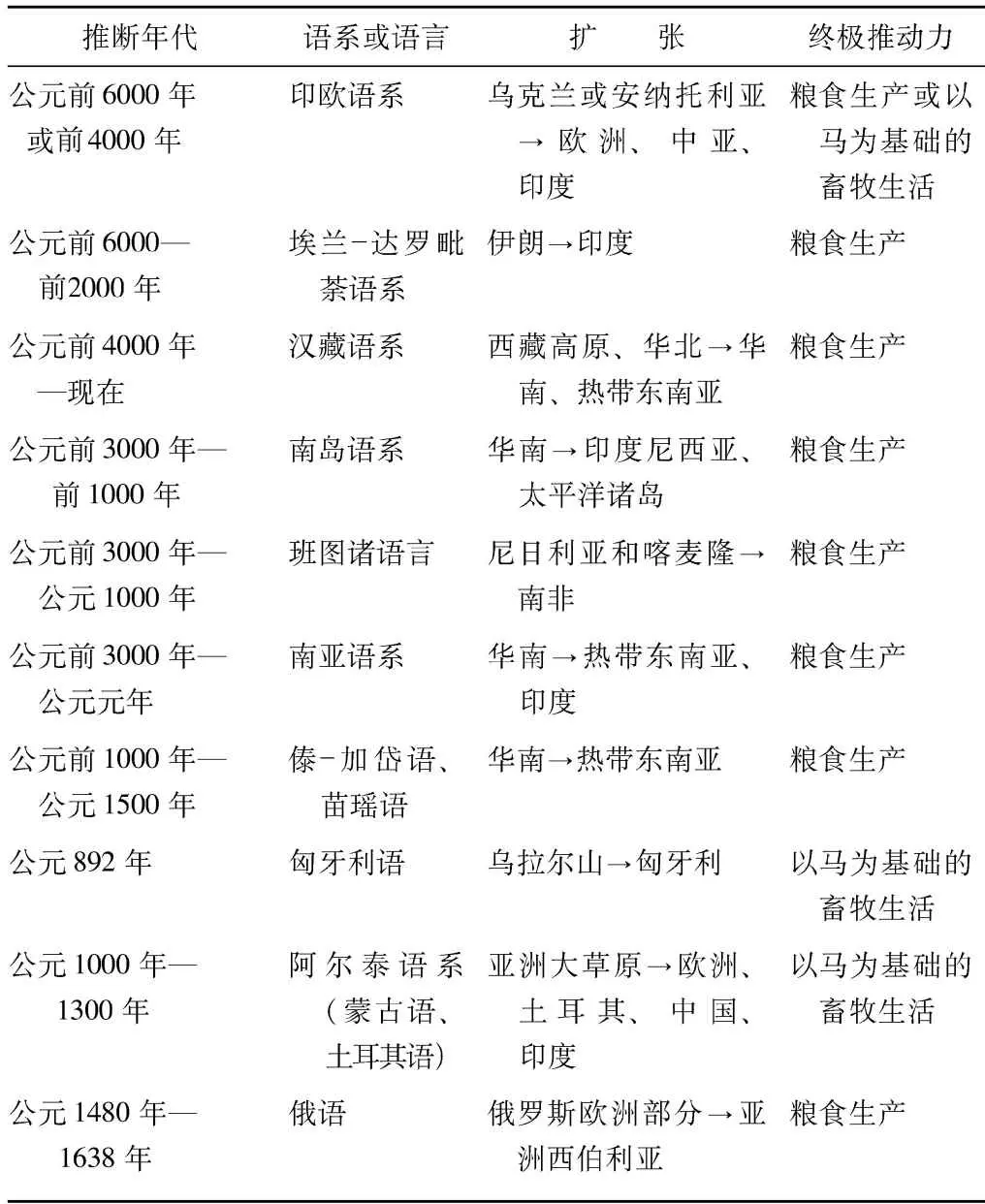 农业在中国兴起后,促成了好几次史前人口或文化特质的大迁徙。其中一次发生在中国本土,创造了今日所知的中国。另一次在热带东南亚,源自华南的农民颠覆了东南亚狩猎─采集土著。再来就是南岛民族的扩张(南岛人源自中国华南,经由台湾到菲律宾和印度尼西亚群岛,继而向太平洋诸岛扩张),他们颠覆了菲律宾、印度尼西亚的土著,深入南太平洋,散布到波利尼西亚各岛屿,但是没能在澳洲与新几内亚殖民。