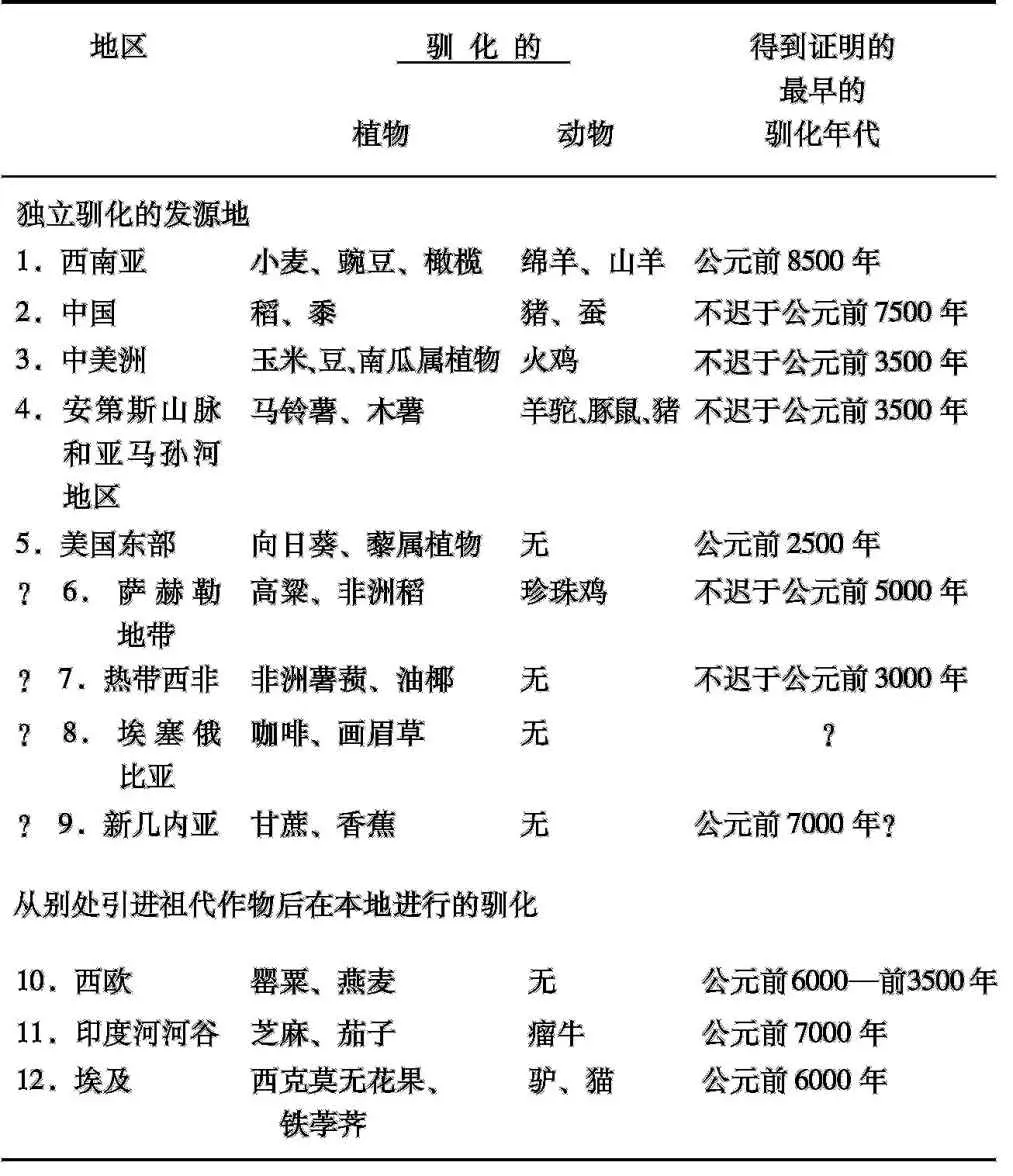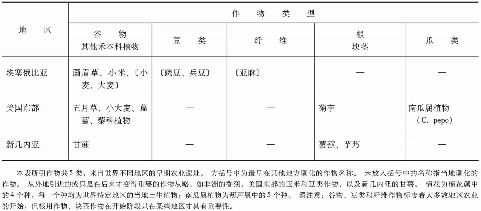 本书第 16 章专谈中国,简略了一点,可是富启发性。在东亚大陆,9000 年前农业就开始发展了。华北以栗米为主,华南则是以稻米和根茎类作物为主。目前的证据显示黄河、长江流域均有这些作物的原生种。这一自然条件使得南北向传播农业的问题消失。南北各自发展出农业文化,再互动、交融,3500年前在环太平洋区域龙蟠虎踞的中国青铜文明,就是在这个过程中成形的。