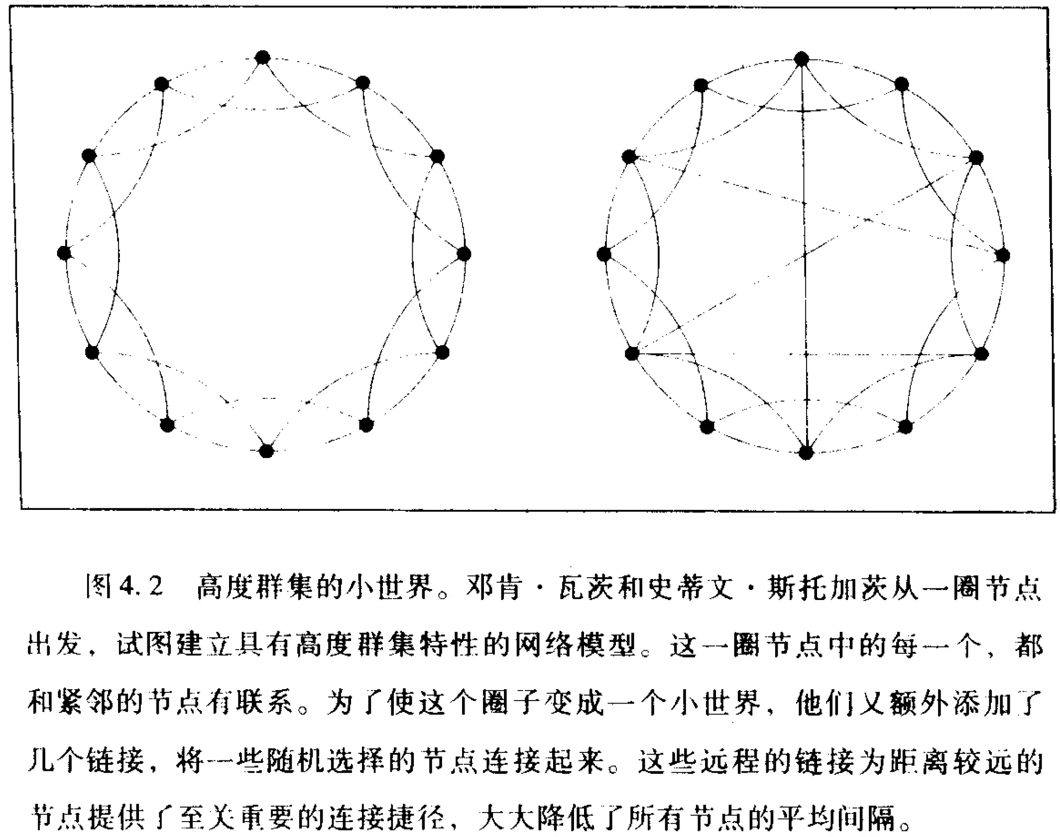 为了回答为何群集现象普遍存在于真实网络系统中,瓦茨和斯托加茨在 1998 年发表于《自然》杂志的论文中,提出了与艾尔德和莱利的随机网络模型不同的新模型。他们提出的模型,首次将群集现象和随机网络图的偶然性统一了起来。他们想象一个圈子里的人(图 4.2)都认识自己紧邻的人。在这个简单的模型中,每个节点都有 4 个邻居,他们之间通过 3 个链接相互连在一起。这样,整个网络就拥有较高的群集系数。事实是,如果所有的 4 个邻居都是相互链接的,那么他们之间应该有 6 个链接。由于此模型中他们之间的链接只有 3 个,因此群集系数是 3 除以 6,也就是 0.5,和我们在数学家网络中得到的 0.56 的值非常接近。要想证明这一结果确实反映了高度的群集现象,我们可以假设在一个随机网络中,某个典型的节点仍然有 4 个邻居,但却是和整个系统中的任意节点随机连接在一起。这样一来,其 4 个邻居之间的链接数,就取决于网络的规模。如果网络如图所示拥有 12 个节点,那么其群集系数为 0.33。如果有 10 亿个节点,这个数就会下降到 4×10-9!很显然,新的模型预计群集系数为 0.5,和这些数值相比要大得多。