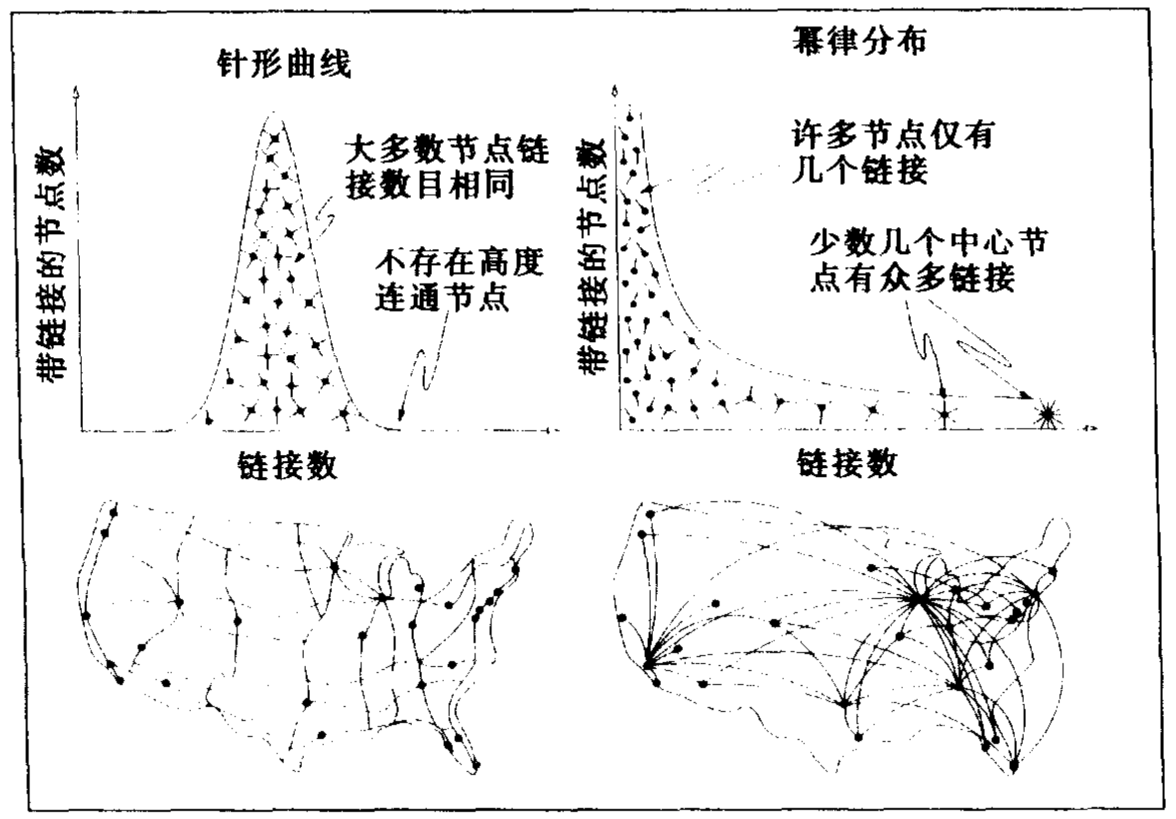 在随机网络中,分布中的峰值意味着大多数节点的链接数量都相当,偏离此数量的节点极其少见。因此,随机网络的节点连通性具有自身的尺度特征,这种特征由普通节点体现出来,并受等级分布峰值的限制。与此相比,在幂律分布的网络中,缺乏峰值。这说明在真实网络中,不存在带有普遍性的典型节点。我们看到的是连续的有等级差别的节点,从罕见的中心节点到无数的小节点一级一级分布开来。最大的中心节点后面紧紧跟着两个较小的中心节点,然后是十几个更小的节点,以此类推,直到最后的无数的小节点。