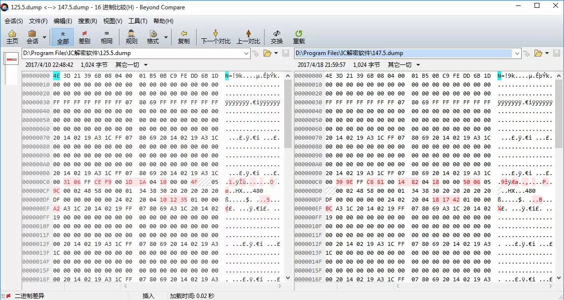 重新打开125.5.dump和147.5.dump,将4个文件第三扇区内容进行对比