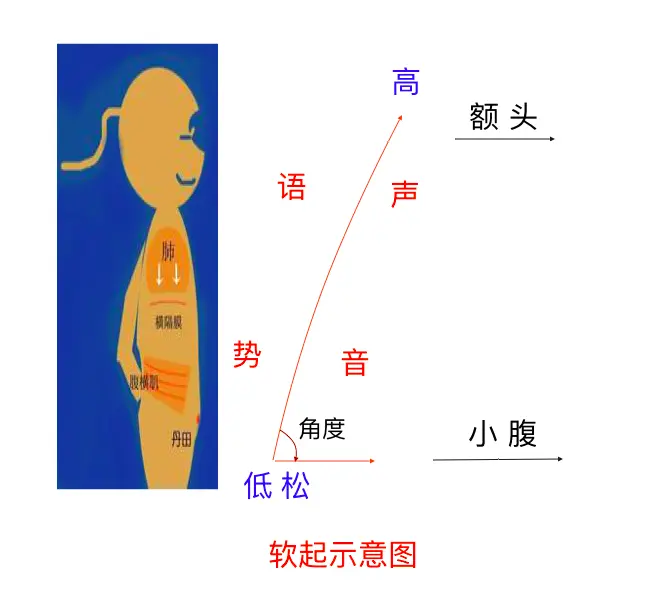软起:即低起,在自然进气量的基础上(防止耸肩提气)从小腹位置起音。发声前不先撑肚子、后腰,要和发声同步进行。每一句话的第一个字轻松的发声,让气流与声音同时出来。可以结合声手同步实现,抽象语言具体化。如果发音时,发音太冲,表明没有做到软起。要领,随着发音过程,手指从小腹下端,一直指向且高过额头。吸气吸七成,比平常自然进气量稍多一点。声音不要过实。发音时,开嘴起音,可以消减喷话筒的声音,同时也有助于软起。