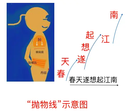 抛物线:是符合生理发声规律的一种语势状态。即声音由下往上,由内而外的发音。用声手同步作抛物线指引,可以有效的实现有声语言的抑扬顿挫。手往上的时候发音,从额头缓慢落下的时候换气。抛物线有两个端点:1起音端点,小腹丹田;2上齿背,硬腭前(gikihi的位置)近腭点,发sh的位置。注意抛物线的角度,和受众范围、对象感之间的关系。抛物线的角度和受众对象成正比。每个单位语义就是一个抛物线。
