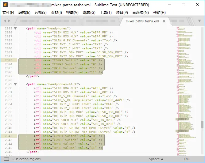 找到/system/etc/mixer_paths_tasha.xml这个文件(图三)复制出来 找到合适的XML编辑器打开,在两个对应位置各加上4行代码(图四图五) 代码如下: