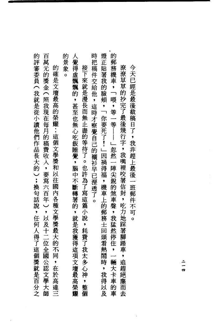 潦潦草草的抄完了最后几行字,我嘴里咬着信封,吃力地踩着脚踏车,追赶绝尘而去的邮务机车,「喂,等一等——」忽然一阵尖锐的煞车声,我猛然停住,一辆大卡车的车灯正贴着我的脸颊,「你要死了!」因祸得福,机车上的邮务士回头看看热闹时,我得以及时把稿件交给他,这时才察觉自己的衬衫早已湿透了。