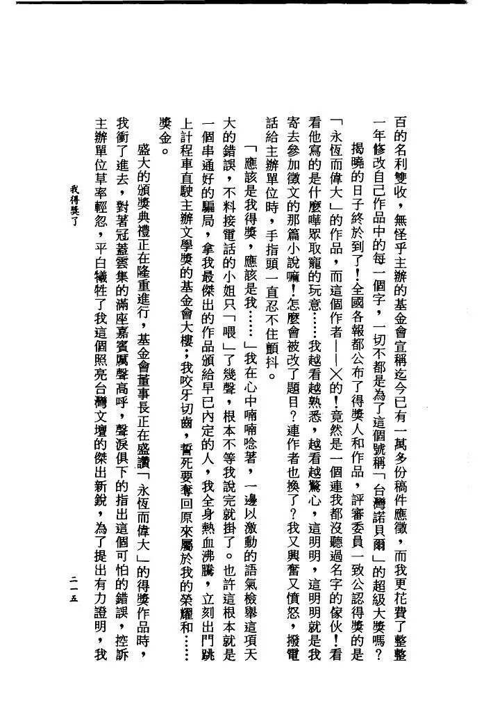 「应该是我得奖,应该是我……」我在心中喃喃念着,一边以激动的语气检举这项天大的错误,不料接电话的小姐只「喂」了几声,根本不等我说完就挂了。也许这根本就是一个串通好的骗局,拿我最杰出的作品颁给早已内定的人,我全身热血沸腾,立刻出门跳上计程车直驶主办文学奖的基金会大楼;我咬牙切齿,誓死要夺回原来属于我的荣耀和……奖金。