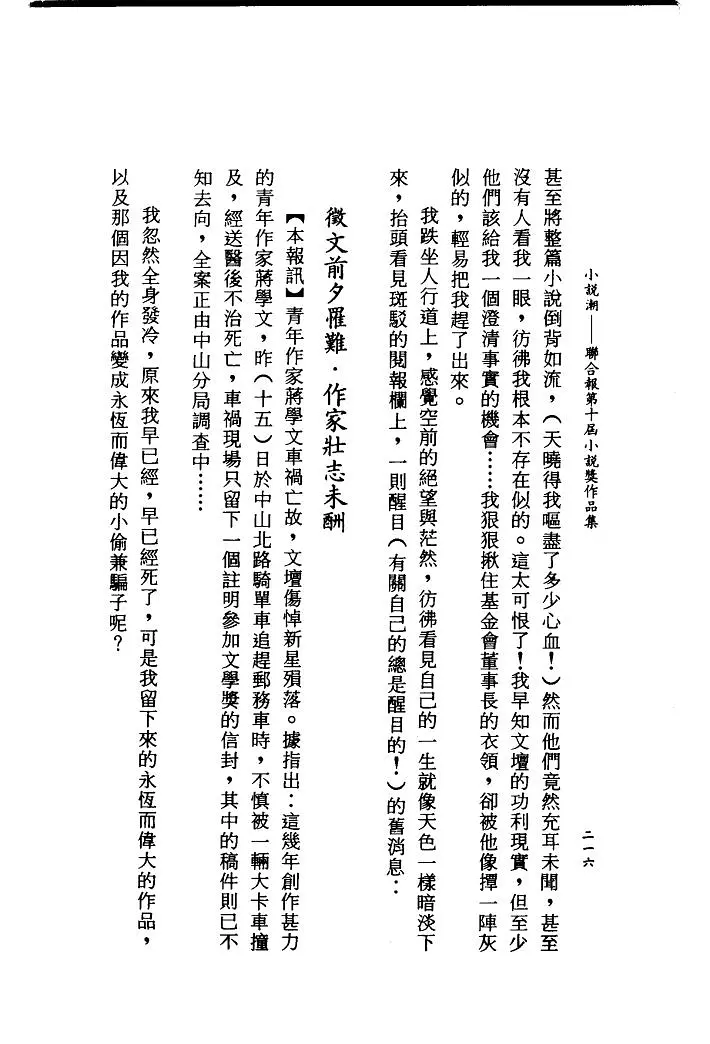 【本报讯】青年作家蒋学文车祸亡故,文坛伤悼新星殒落。据指出:这几年创作甚力的青年作家蒋学文,昨(十五)日于中山北路骑单车追赶邮务车时,不慎被一辆大卡车撞及,经送医后不治死亡,车祸现场只留下一个注明参加文学奖的信封,其中的稿件则已不知去向,全案正由中山分局调查中……