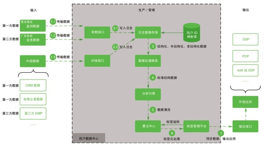 流程 7:标签管理平台通过输出接口同步数据到各数据应用平台,如 DSP、PCP、AdX/SSP 或其他平台。