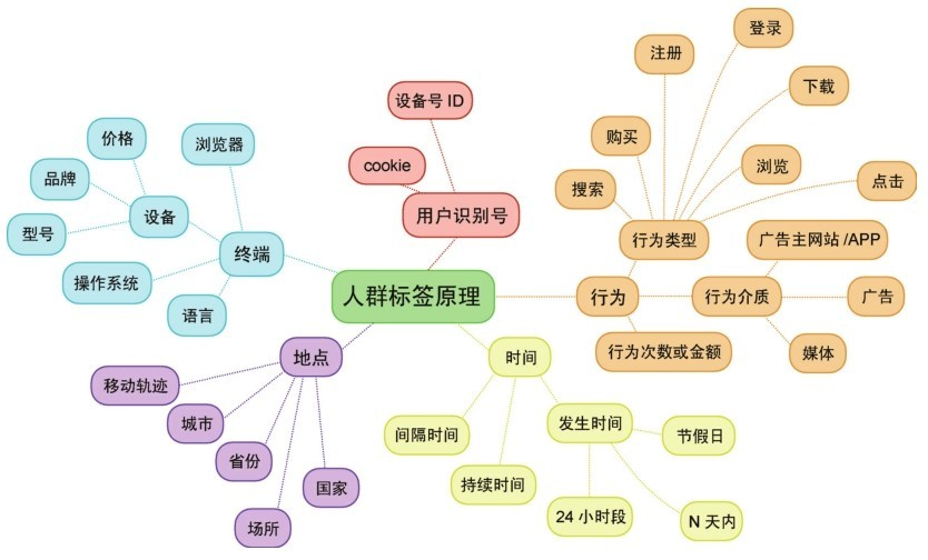 定向目标人群需要在设置广告活动时选择人群标签(tag),它有可能是广告投放平台的自有标签,也可能是第三方 DMP 的标签。标签一般包括用户的性别、年龄、行业、收入、婚姻状态、教育背景、兴趣爱好等。为每个用户打人群标签时,主要是基于用户识别号、用户行为、时间、地点、终端等属性进行综合分析,并标记该用户在各个维度上的属性特征(同一个用户会对应多个标签)。具体如下图所示。