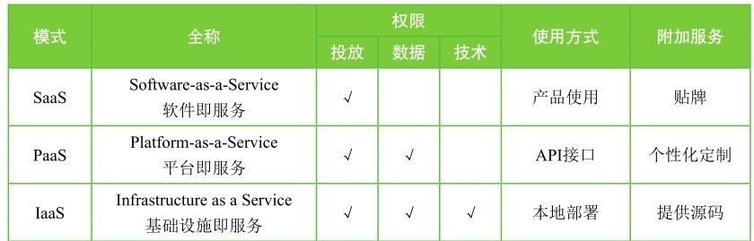PaaS:Platform-as-a-Service(平台即服务)的简称,产品形态是平台。需求方可以通过 API 接口调用数据、设置策略、整合需求方自身的其他产品等。有些供应商还会提供算法接口,需求方可以通过接口运行自己或者第三方的算法模型。这种模式的数据和技术所有权仍然属于供应商。部分 PaaS 供应商能够为需求方定制个性化功能并贴上其品牌,这种服务称为 OEM(Original Equipment Manufacturer,代工生产)。该模式一般也是通过赚取广告位差价或者收取技术服务费来盈利。