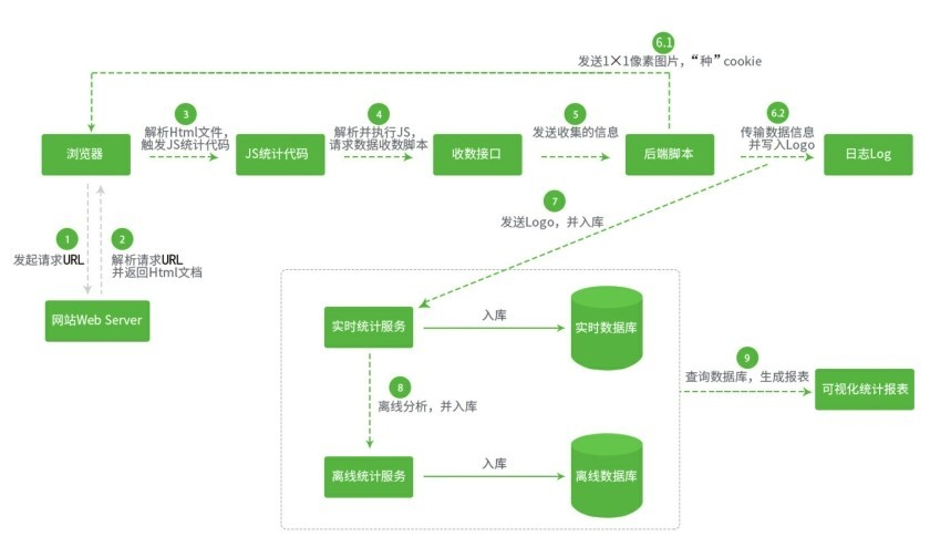 流程 6:流程 6.1 后端脚本生成透明 1×1 像素图片,在浏览器中种入 cookie 标识访客。流程 6.2 后端脚本解析并发送流程 5 得到的信息,同时从网站 Web Server 获取 IP、访问时间等信息,写入日志 Logo 队列。