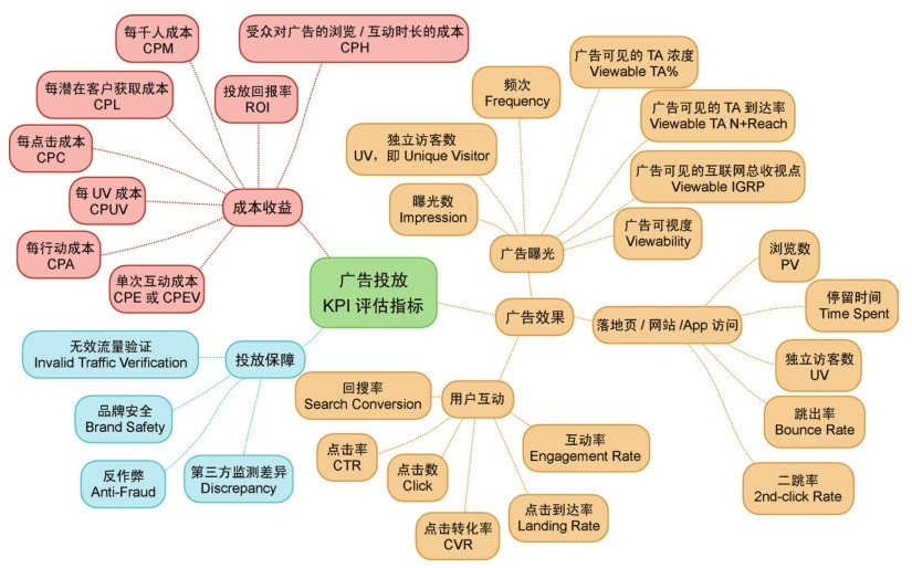 广告效果: 衡量用户活跃度及其对广告的接受度。从广告效果的层次来说,传播效果可以用广告曝光维度衡量;心理效果一般很难直接评估,但是可以通过用户的行为效果进行衡量;行为效果可以从落地页/网站/App 访问以及用户互动角度进行考核。