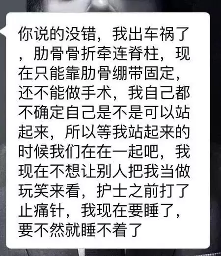 那天晚上,从你发小口中听到你出车祸的事,上一分钟,你还很开心的给我发你去其他地方的照片,我说,你怎么了,是不是出车祸了,你骗我说:安彦,别咒我,我好好的。经不住我连续的发问,你终于承认自己出车祸—— 肋骨断裂脊柱侧弯, 可能面临以后走不了路的人生。